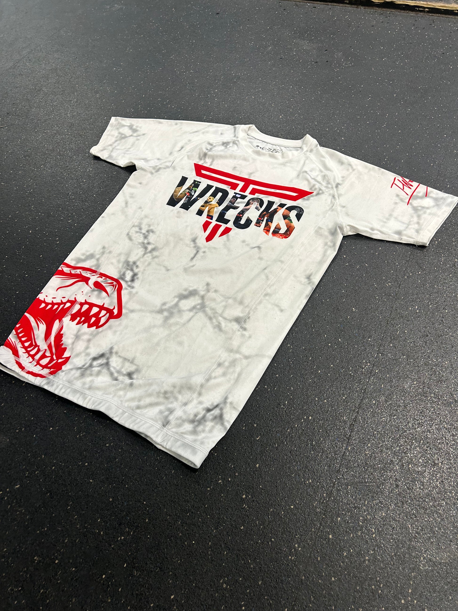Featuring a crisp white marble base, blood red T-Rex jaw prints, and a battle-scene filled WRECKS logo, this kit was built to match McKinney's explosive style and power. Whether you're grinding through rounds or showing out on the mats, this rash guard is perfect for those who embody the KILL OR BE KILLED mentality.