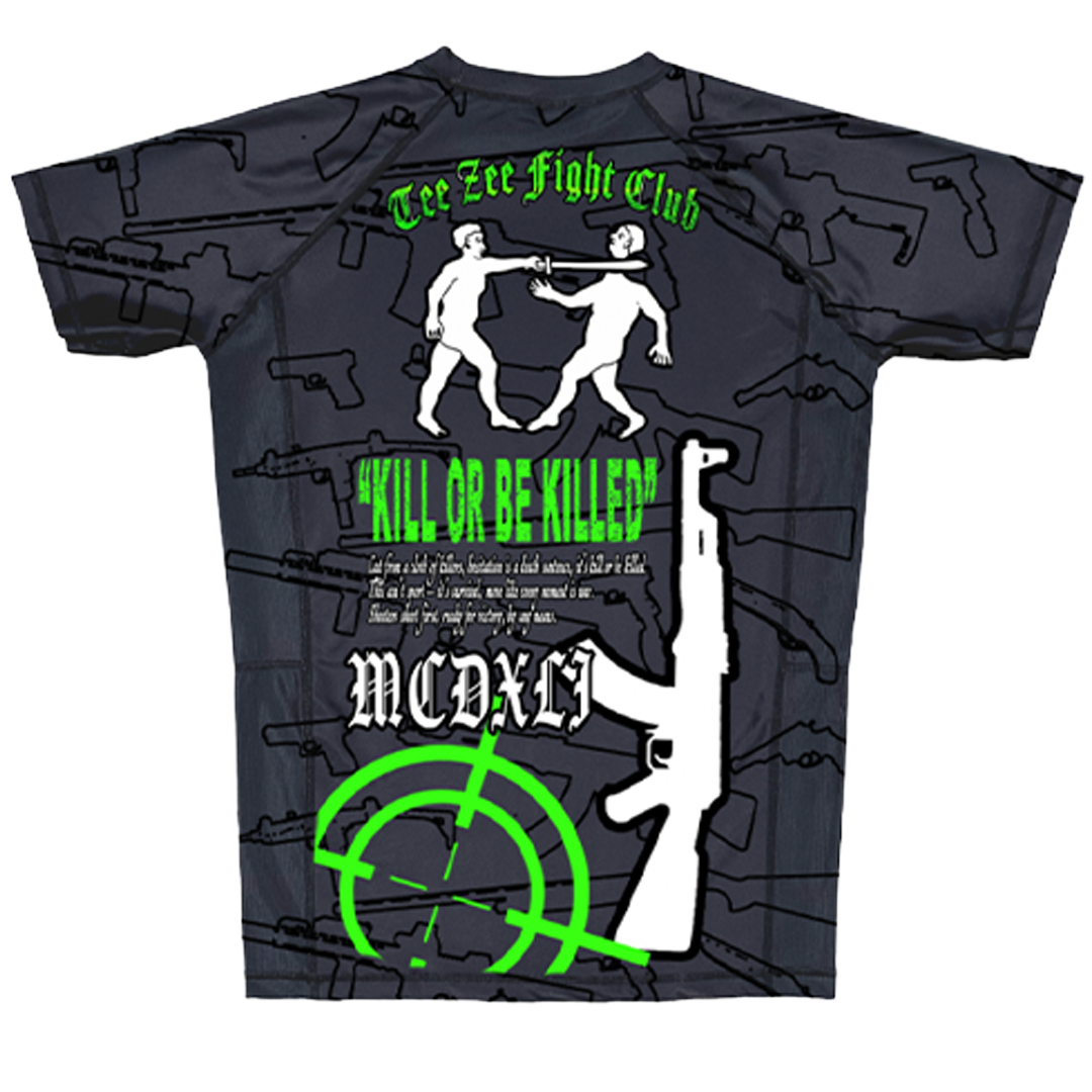The front features our signature TEE ZEE FIGHT CLUB crest in striking green, while the back showcases the unapologetic slogan — “KILL OR BE KILLED” — alongside our combat graphic and roman numeral insignia. Cut from the same DNA of defiance, hesitation is death, and survival belongs only to the relentless.